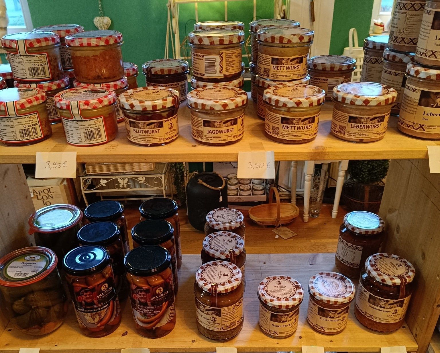 In unserem Hofladen führen wir viele schmackhafte Produkte der Feldküche Wittenberge. Das regionale Familienunternehmen ausgebildeter Köche in zweiter Generation produziert leckere Wurstwaren, handgefertigte Suppen und Eintöpfe, die in Gläsern angeboten werden. Nach Aussage des Unternehmens ist Ihnen dabei "die Naturbelassenheit der Produkte", die fast vollständige Herstellung der "Glaskonserven ohne Geschmacksverstärker, Konservierungsstoffe, Verdickungsmittel und andere industrialisierte Hilfsmittel" sehr wichtig. (Quelle: die-feldkueche-wittenberge.de)